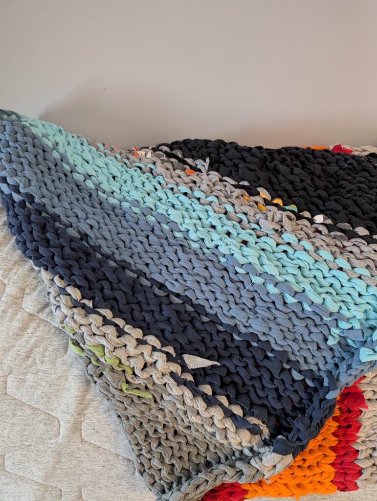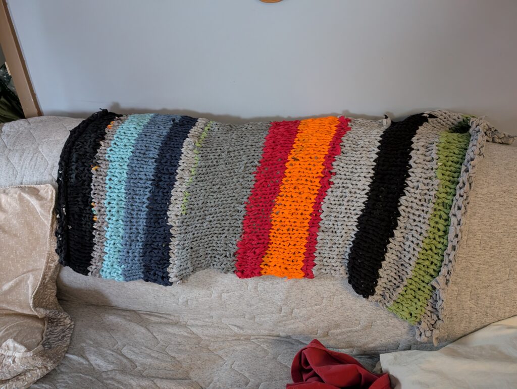 Anyway the end result is a heavy thick blanket with a lot of wonkiness. I’ll be making more yarn from more old t-shirts and making at least one more of these and possibly a scarf as well. The goal here, is to reuse my old shirts and create something new from them. I’ve made many swiffer pads and absorbent rag pads and even with that I have dozens of old knit shirts that need to be recycled and reused.